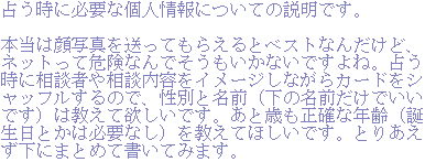 あと相談内容やメールの内容は、いろいろ考えたすえ削除することに決めました。「占うのはやめとく」と決断した人はその日のうちに、「占う」と決断した人は占いすべてのやり取りが終了してからの削除となります。 これから後も占いを頼むかも、という人のため保存して後々の参考にしようかとも思ったけど念のため削除します。 「保存しておいてほしい」という人はその旨を私に伝えてください。その場合パソコンには保存せず、フロッピーに保存したのちメールは削除という形をとります。 |